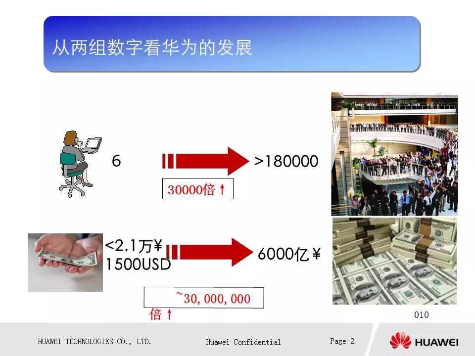 华为是从6个人起家,成为拥有18万人的大家庭,今年的收入估计是6千亿以上,之前是2万1千块钱,现在6千亿,三千万倍的增长。