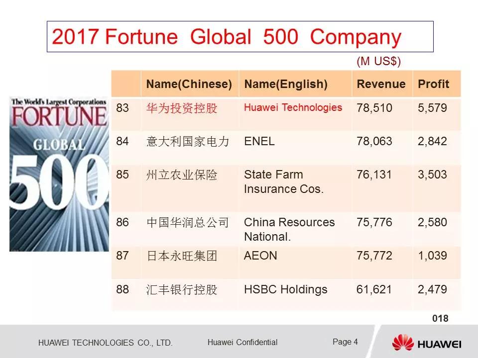 世界五百强,我们现在排名83,“华为不仅仅是世界五百强”,现在这个广告假如要继续发布的话,应该改成“华为不仅仅是世界一百强”,当然它的本意除了排名之外,还有更深层的内涵。