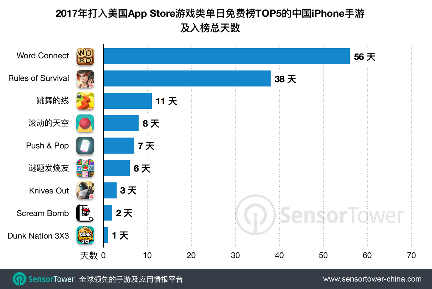 9款中国手游打入2017美国App Store游戏类单日下载榜TOP5,比2016年多3款
