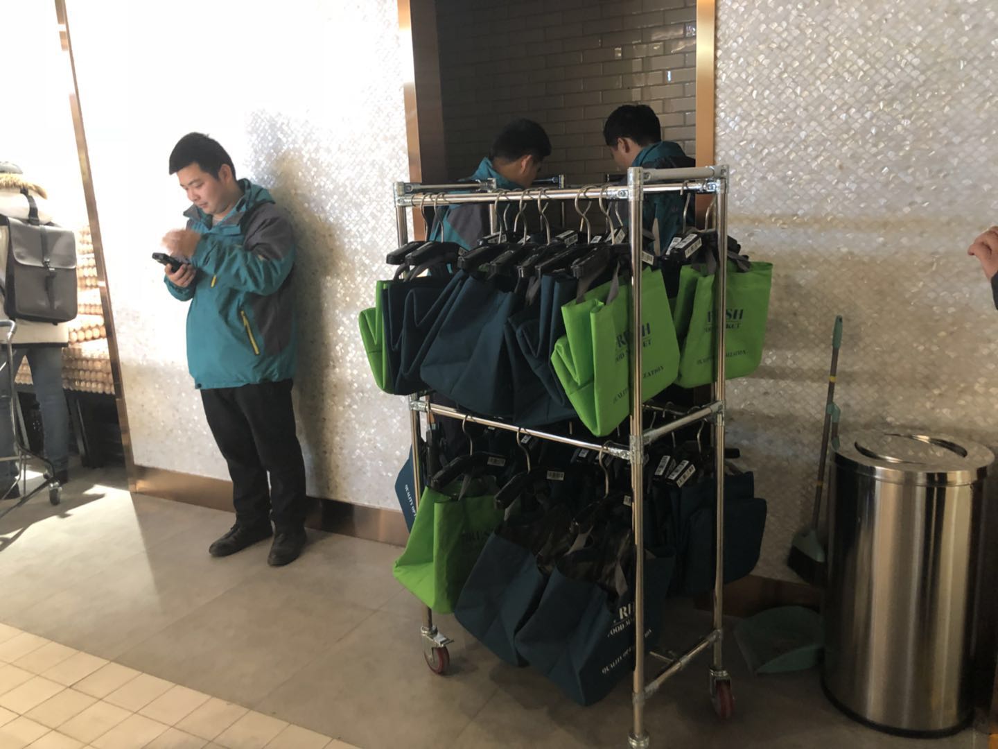 与盒马一样,7fresh仓储的解决方案是仓店一体。在7fresh门店内,随处可见身着绿色工装的拣货员手持巴枪(数据传输、分单的终端)和生鲜袋来回穿梭,总人数在三、四十人上下。在开业促销价59元一盒的车厘子旁,几乎每一分钟都有拣货员来取货。他们的动线由系统调配,以达到最优,从超市内分散的若干传输口内,生鲜袋被挂上悬挂链,传输到后场进行打包。
