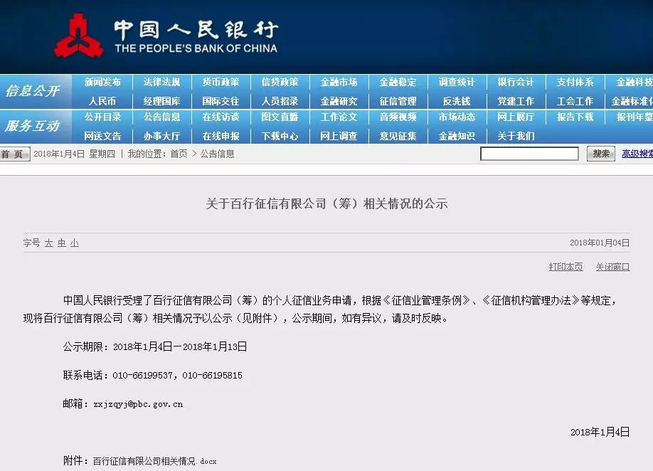 1月4日晚,中国人民银行发布公示,受理了百行征信有限公司(筹)的个人征信业务申请。如果这个俗称“信联”的平台从1月4日起到13日的公示期间没有收到异议,下一步就是批准筹建。