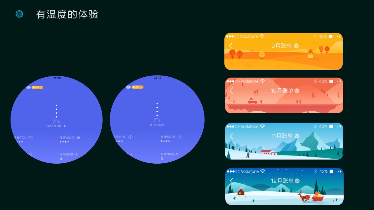 金融平台很重要的一点是要展示专业性, 高大上的视觉风格, 所以有时候会听到吐槽“冷冰冰”。然而,我们的产品经理和设计师们也并非真的没有注入自己的温度,只是这种细节的展示要避开一些关键的,需要决策的流程和场景。