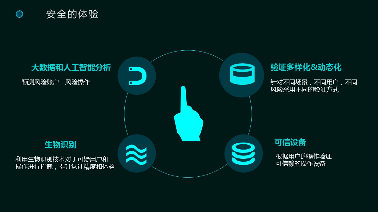 这些验证方式包括一些生物识别的技术,比如前面提到的人脸识别,声纹识别,提升用户快速验证的体验,也能优化我们认证的精度。