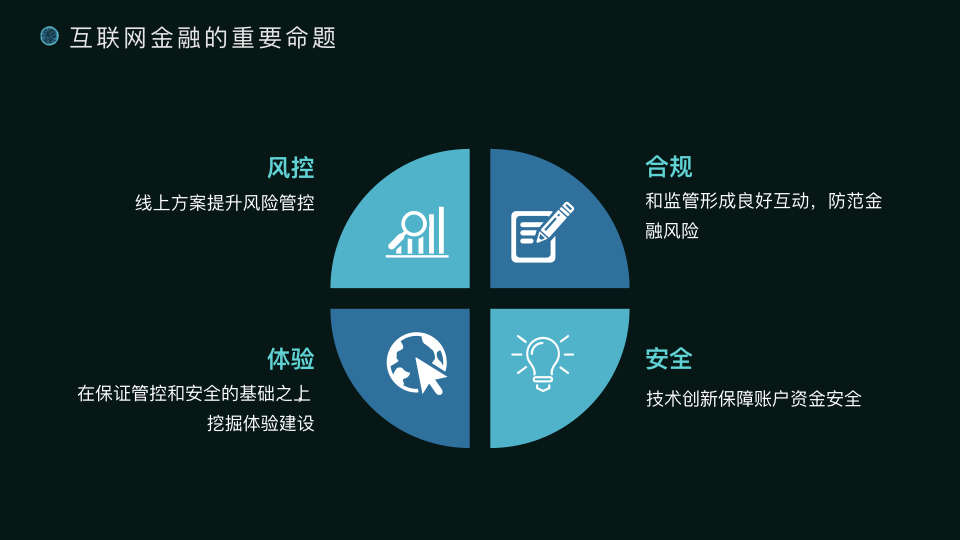 互联网金融在过去的几年发展中面临的重要命题包括风控,合规,安全和体验。