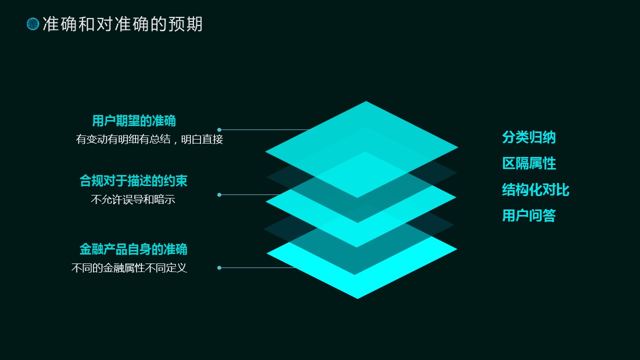 大家考量一个互金平台,准确性是基础。 从用户层面期望的准确性,例如在各项信息描述的准确容易理解的,或者账户资金和资产的任何变动都是可解释的。