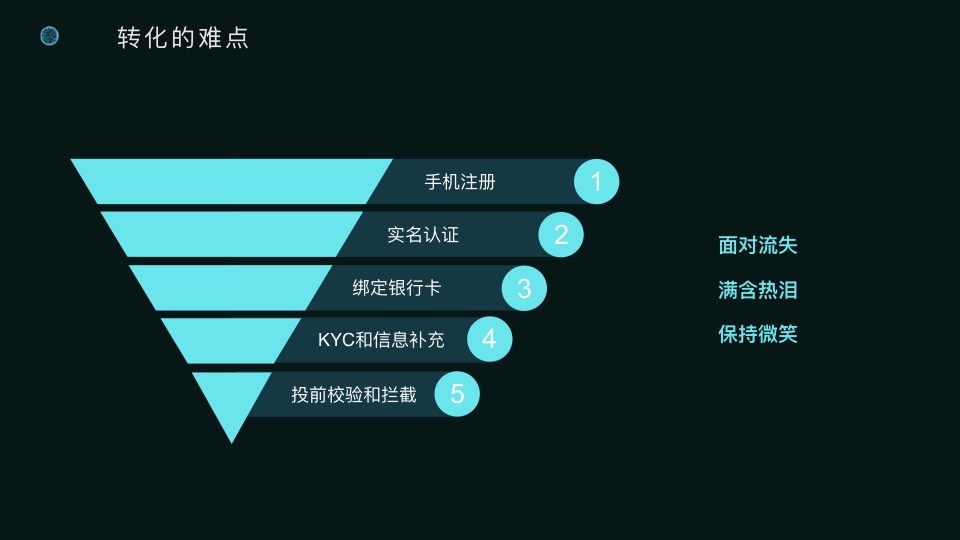 前面提到的三个方向:风控,合规和安全是金融的本质要求,也是互金平台的产品经理在设计思考时不容质疑和商榷的硬杠杠。在这样的基本前提之上,互金平台的产品经理在推进产品和功能实现的过程中会遇到哪些不一样的困难,又如何克服它们?下面将会从转化,准确性和流畅三个角度进行分析。