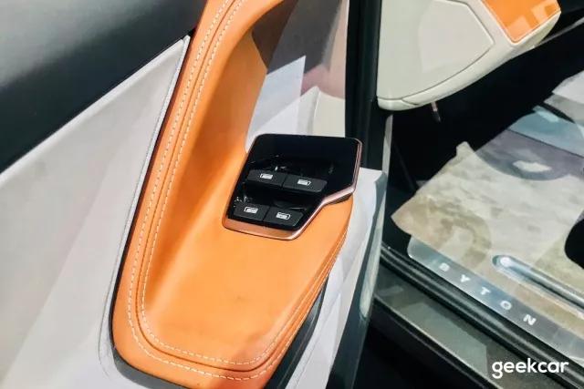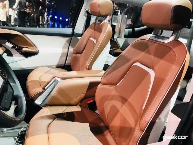 展车座椅为四个独立座椅设计,看起来有一定豪华感,前排座椅可旋转,旋转角度是 12 度。供应商应该是佛吉亚,类似的概念产品之前我就在佛吉亚的车展展台上见过,这次相当于是把它量产化了。很明显是为自动驾驶场景所设计。