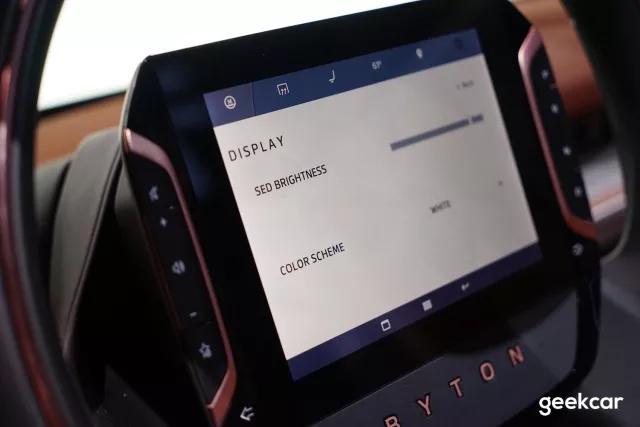 方向盘上有个 8 英寸的触摸屏,也是目前已知唯一可量产的方向盘屏幕。它用来控制共享全面屏以及导航、座椅调节等功能。触摸屏两侧还整合了挡位键等全车仅有的几个物理按钮。