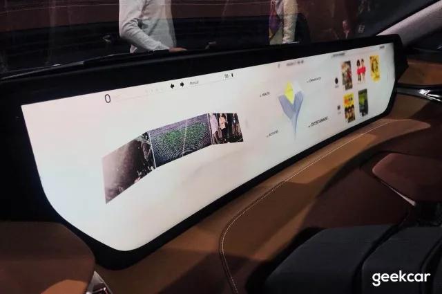 中控大屏是 1.25 米宽、25 厘米高、50 寸的面积,官方称为「共享全面屏」,屏幕 UI 目测为三段式设计。目前已知有量产计划的最大尺寸车内屏幕,不可触摸。