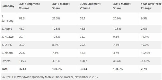 既然如此,我们不妨看看目前和未来小米手机业务的表现和预期。据IDC对于去年第三季度全球智能手机销量统计显示,小米当季销售了2760万部智能手机,同比增长102.6%,增长率不仅居排名前5之首,而且是大幅领先。当然这和2016年小米手机同季跌入谷底密切相关,即这种高增长的背后更多属性是反弹而不是增长,毕竟在2015年全年小米曾经创造过年出货量7000万部的记录,而小米2017年在大幅反弹后的销量不过如此(预计也在7000万部左右)。那么问题来了,小米何以大幅反弹?