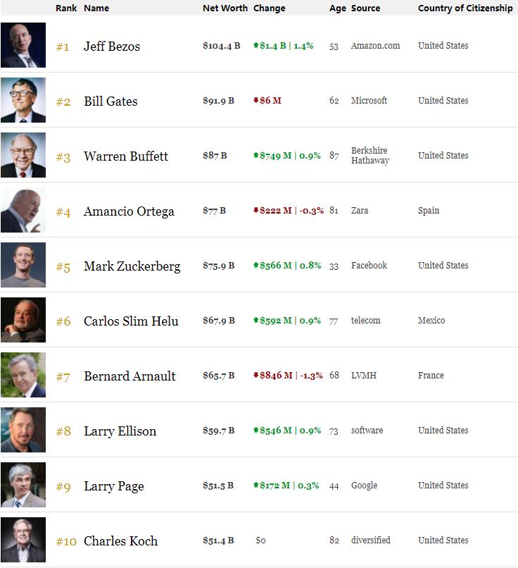 而股神巴菲特位列第三,总财富为870亿美元,西班牙兼欧洲首富奥特加以770美元排名第四,扎克伯格则以759亿美元排第五。