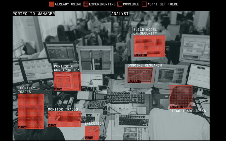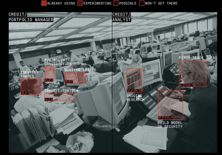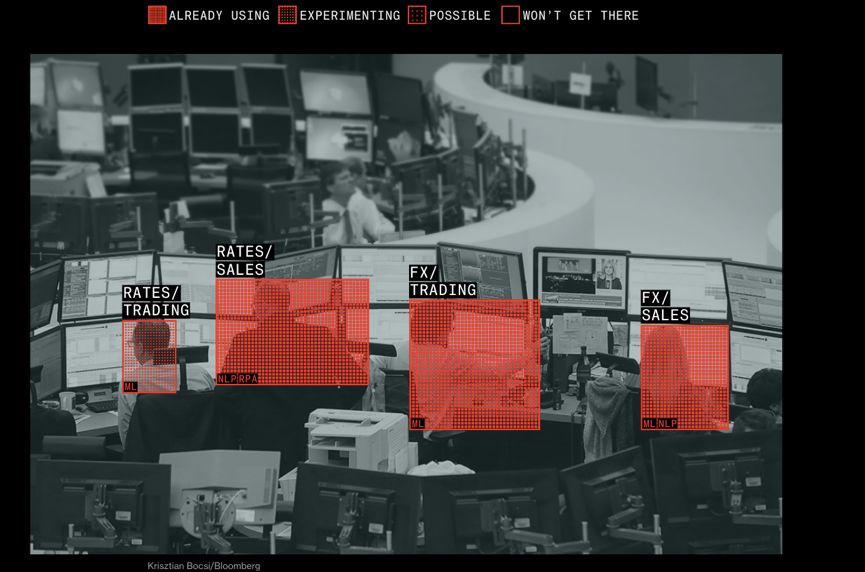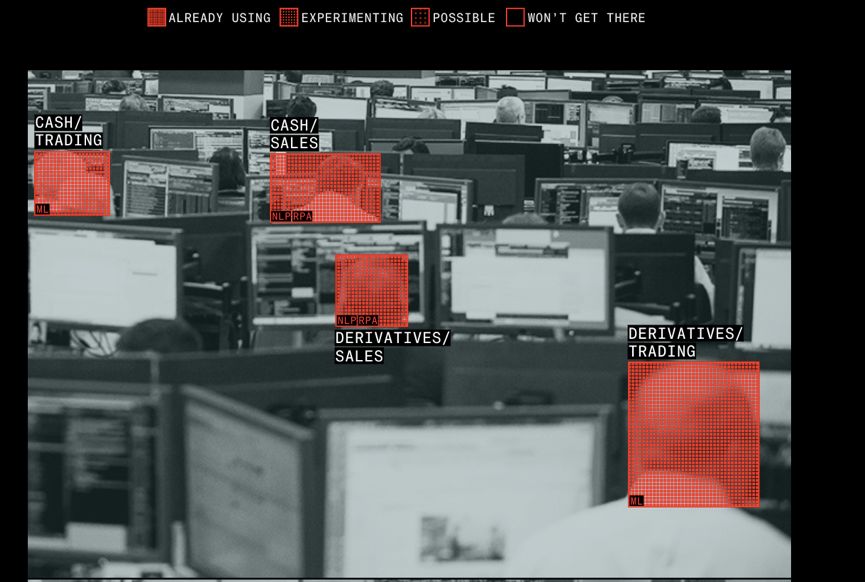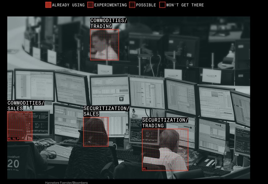 Bloomberg曾采访了许多华尔街金融机构的高管,制作了一系列自动化交易图。红色方框底部的黑色文字是在交易过程中使用的人工智能技术,包括机器学习(ML)、自然语言处理(NLP) 、机器人过程自动化(PRA) 、预测分析(PA)。