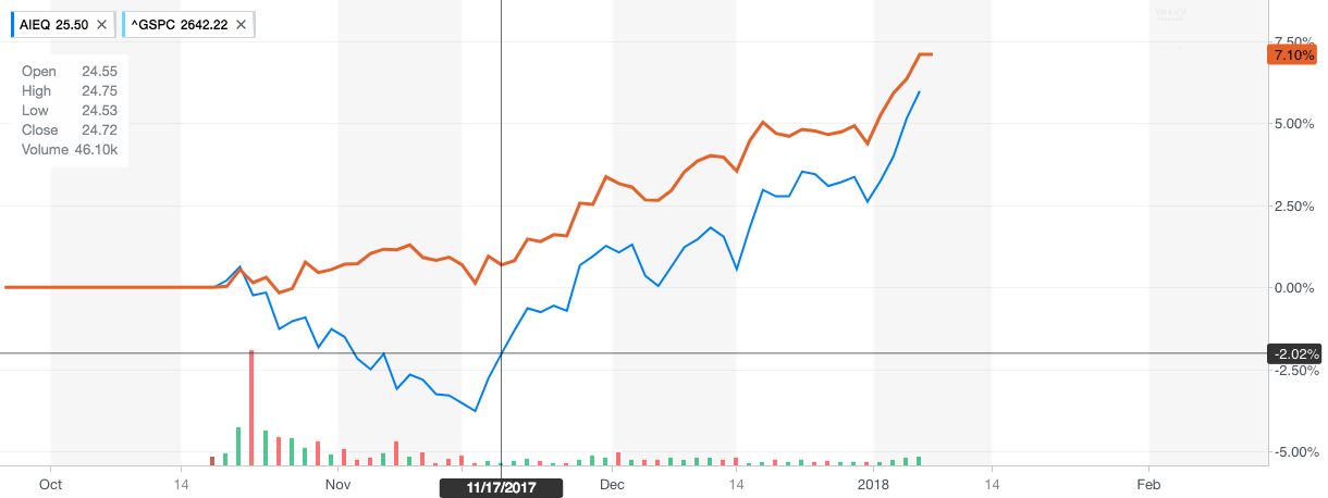 在交易前三日,AIEQ达到了0.83%的回报率,跑赢了美股大盘。在一个惊艳亮相之后,这支人工智能基金之后的表现却不尽人意。从去年10月中到11月中,AIEQ净值一度最低下跌到略高于24元,单月跌幅逾4%。截至2017年年底收盘,AIEQ涨幅0.6%,美股标普500指数涨幅为3.39%。整体而言,AIEQ持续跑输大盘。