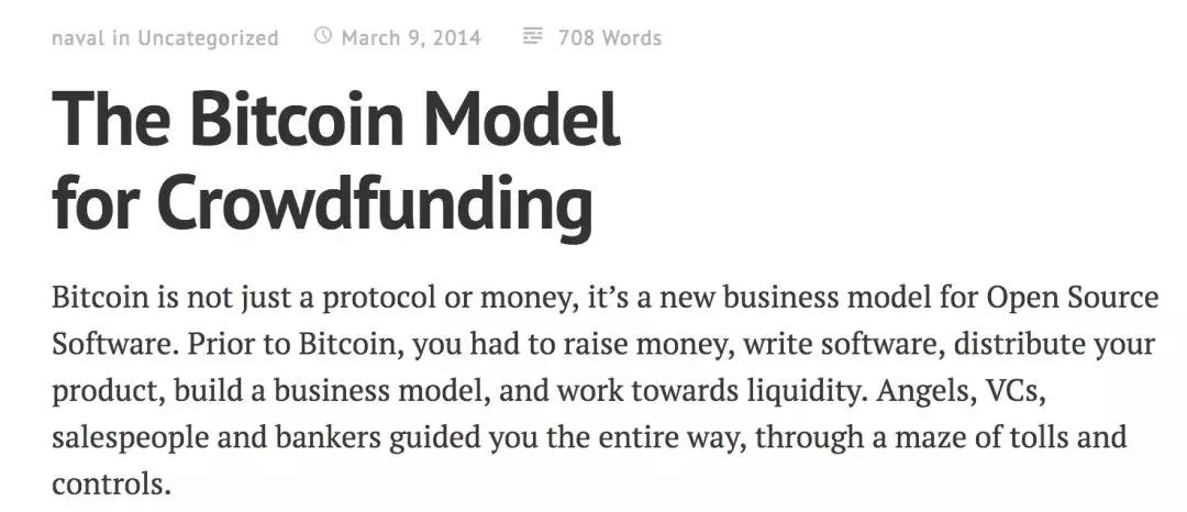 之所以这样说,是因为他在2014年就写了一篇关于“比特币模式众筹”的畅想: