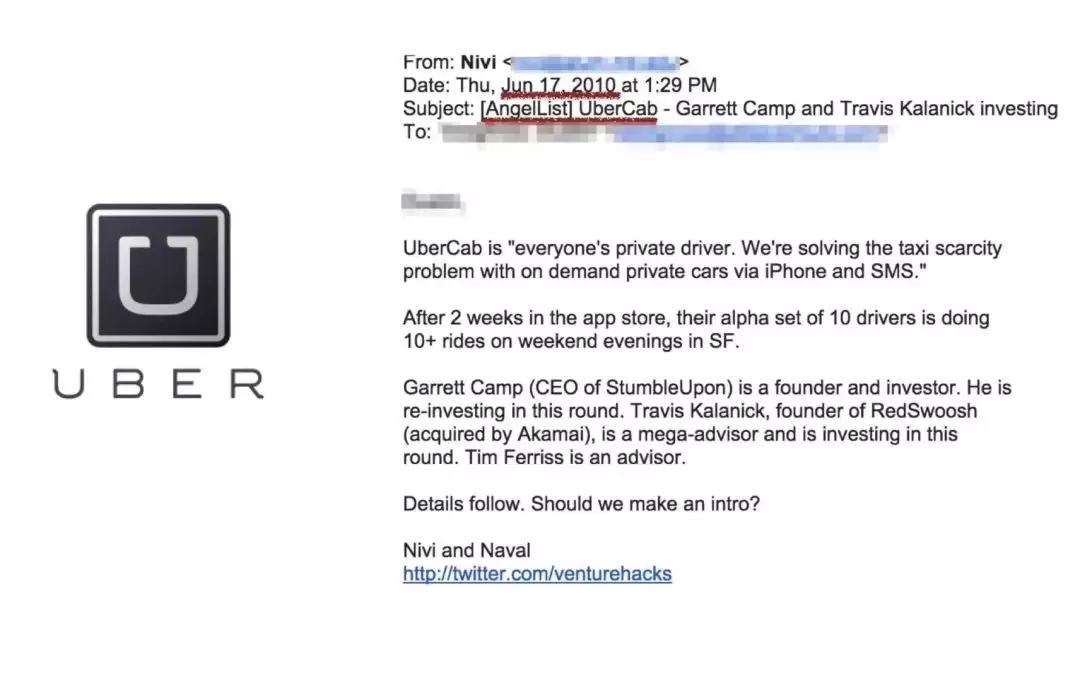 其实早在2010年,他就给165位投资人推荐了一个叫ubercab的项目。