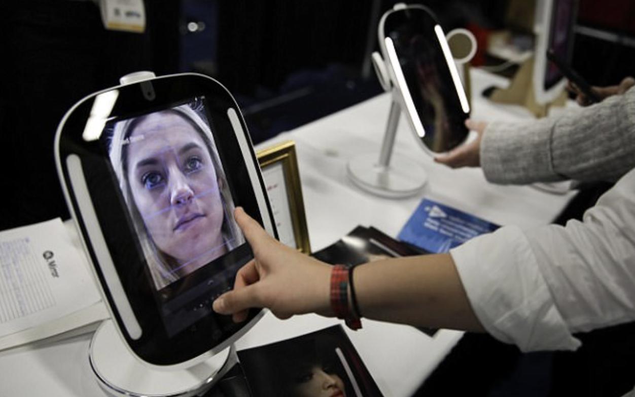 这个小工具叫HiMirror,它使用面部识别技术来分析使用者的皮肤状况,检测皮肤的水合作用以及黑色素含量,评价目前所用的不同美容产品的效果, 以及针对皱纹、红斑、黑眼圈等皮肤问题给你提供一些小建议,比如要不要尝试一些适合使用者的新东西。