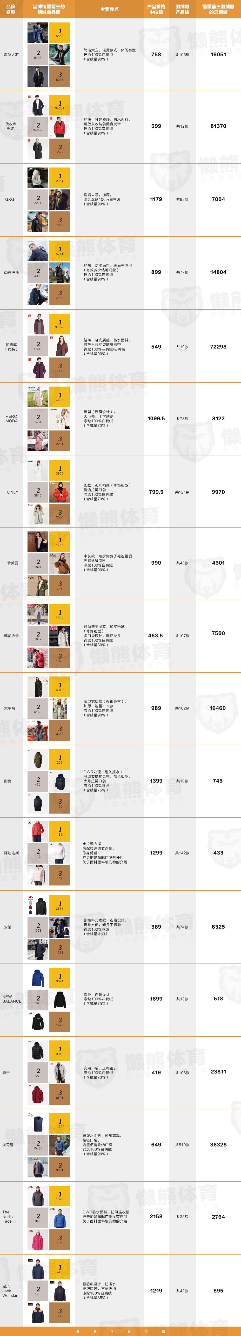 ・从销量上看,快时尚品牌的羽绒服单品销量远超运动品牌及传统羽绒品牌。