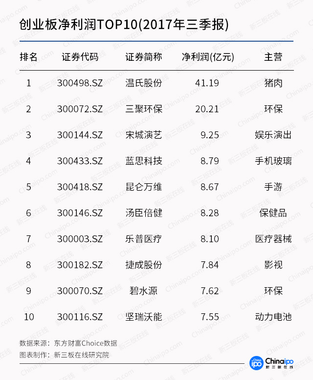 根据净利润排行情况,2017年创业板前三季度,最赚钱的公司是温氏股份,其主营为猪肉、鸡肉销售。温氏股份三季报显示,2017年前三季度公司共实现净利润高达41.19亿元,比起许多主板公司也丝毫不逊色。