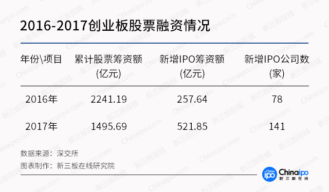 创业板融资额:2017年创业板累计股票筹资额1495.69亿元,较前一年减少745.5亿元,下滑33.26%。其中IPO筹资额为521.85亿元,较前一年增加264.21亿元,增幅102.55%。