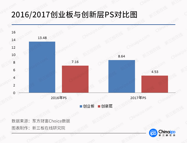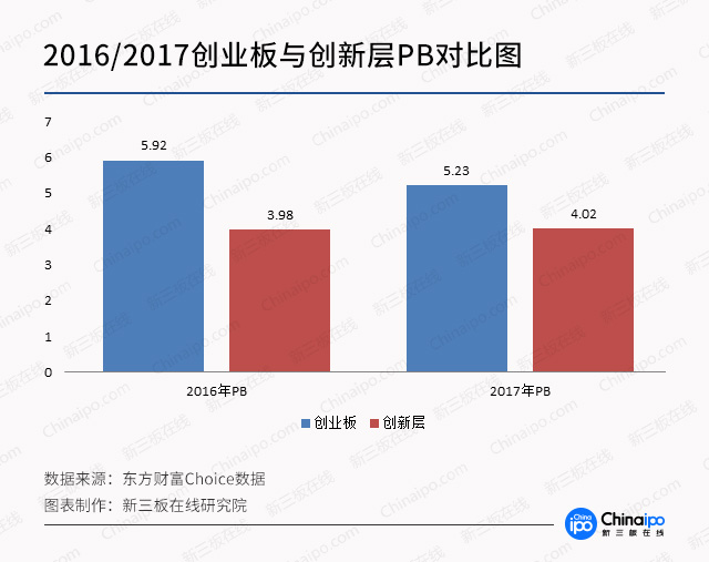 2017年创业板平均PB约为5.23倍,较前一年下降了11.65%;2017年创新层平均PB约为4.02倍,较前一年上升1%,基本稳定。