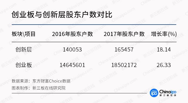 根据新三板在线研究院的统计,截至2017年底,创业板股东户数超过1850万户,同比增长26.33%;创新层2017年股东户数突破了16.5万户,同比增长18.14%。