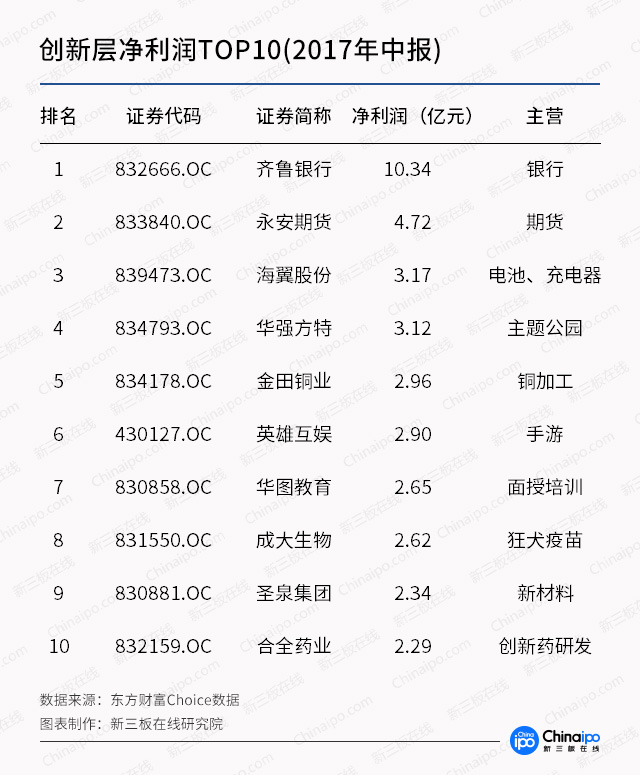 而创新层方面,中报业绩显示,2017年上半年齐鲁银行以10.34亿元的净利润占据榜首位置,第二名是永安期货,两家公司均为金融企业。