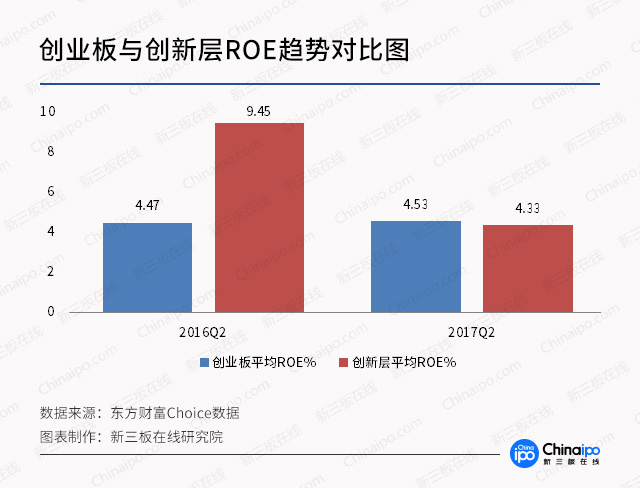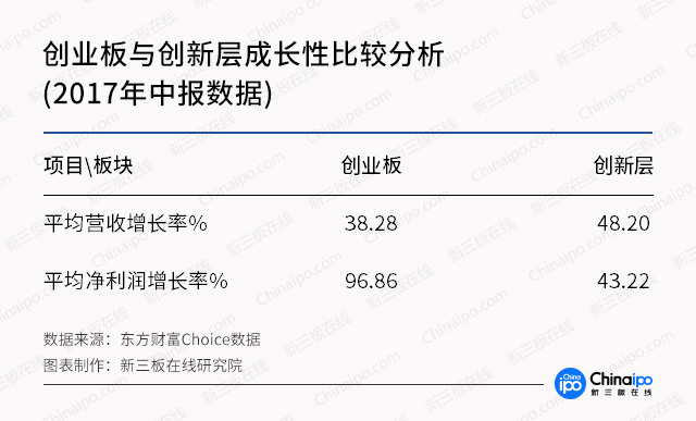 根据新三板在线研究院的统计,对应各自报表期,2017年前三季度创业板营收增幅约为39.45%;创新层在2017年前二季度营收增幅约为48.21%。