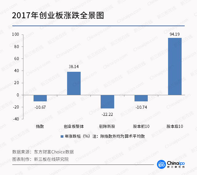 创业板整体来看,710家上市公司平均涨幅38.14%,但剔除2017年新上市的新股后平均涨幅变成了-22.22%,由此可见,新股对整体涨幅的贡献巨大。
