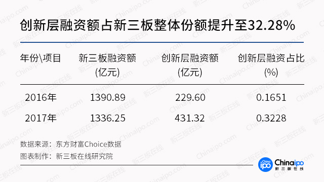 创新层融资额:2017年新三板整体股票发行额1336.25亿元,较前一年减少54.64亿元,下滑3.93%。其中创新层公司融资额431.32亿元,占新三板融资总金额的32.28%。
