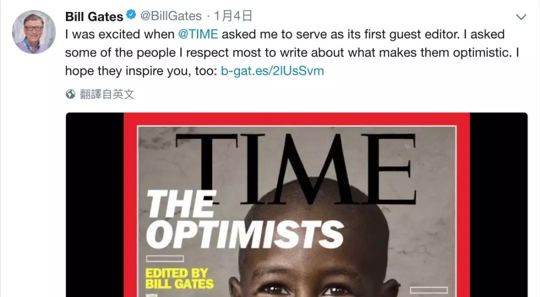 在《时代》周刊客串了一把编辑,比尔·盖茨说,他把这些「好新闻」呈现在大家的面前,不是让大家忽视依然存在于世界上的悲剧和不公正,不是想渲染盲目天真的乐观精神,而是想让你看到,你也可以用一种更积极的视角去看待问题,创造改变。
