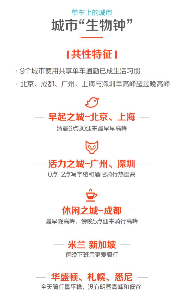 王晓峰介绍,每辆摩拜单车配置的多模定位和移动物联网芯片,日复一日地记载着城市的共性与特性。骑行数据显示,国内城市的“早起晚归”特征明显。清晨6点多钟就迎来骑行早高峰的北京、上海,成为了车轮上的“早起之城”;而广州、深圳的写字楼与酒吧周边,以深夜超高的骑行量,成为名副其实的“敬业之城”、“活力之城”。成都的悠闲个性也通过数据得到了印证,它的晚高峰来得全球最早——下午5点人们就纷纷踏上了回家路。