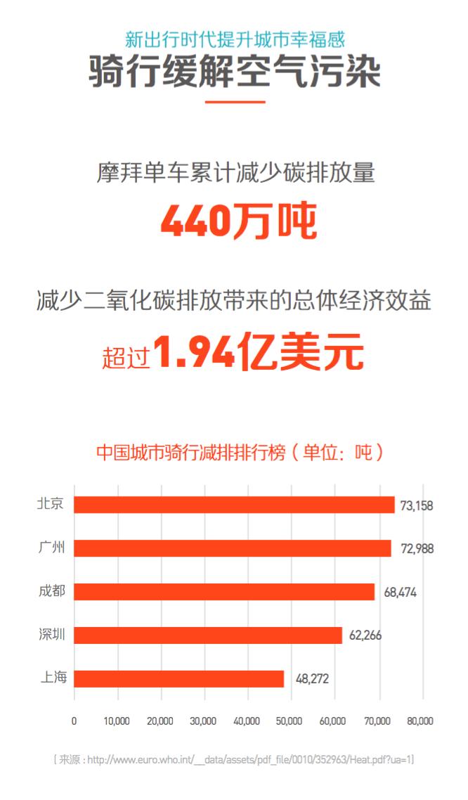 此次报告显示,自摩拜单车运营以来,已累计节约碳排放量超440万吨,相应带来的经济效益超过1.94亿美元。在12个城市里,北京因骑行减少的碳排放量超7.3万吨,位居榜首。