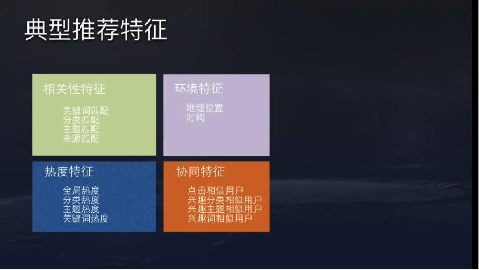 第三类是热度特征。包括全局热度、分类热度,主题热度,以及关键词热度等。热度信息在大的推荐系统特别在冷启动的时候非常有效。