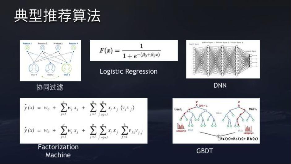 曹欢欢在现场的PPT里公布了头条使用的五种推荐算法,包括传统的协同过滤模型,监督学习算法Logistic Regression模型,基于深度学习的Factorization Machine,以及DNN和GBDT。