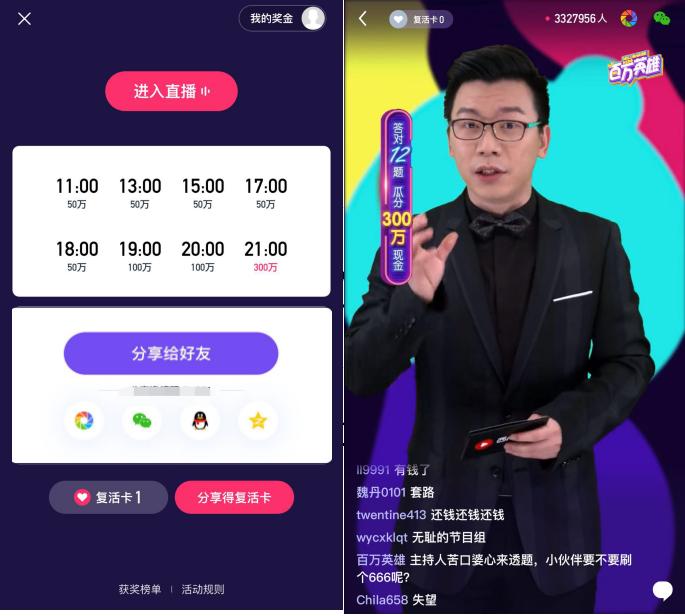 我们看到,随着各大平台直播答题场次的推进,参与人数从20万、40万到50万,100万。而随着其他玩家的入场,可以想象,直播答题很可能会玩成一个巨头轮番持续砸钱的游戏。