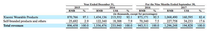 根据数据,在2015年、2016年和2017年1-9月份,小米手环为华米科技贡献的收入分别为8.7亿元、14.34亿元和10.68亿元,占到华米科技同期收入的97.1%、92.1% 和82.4%。