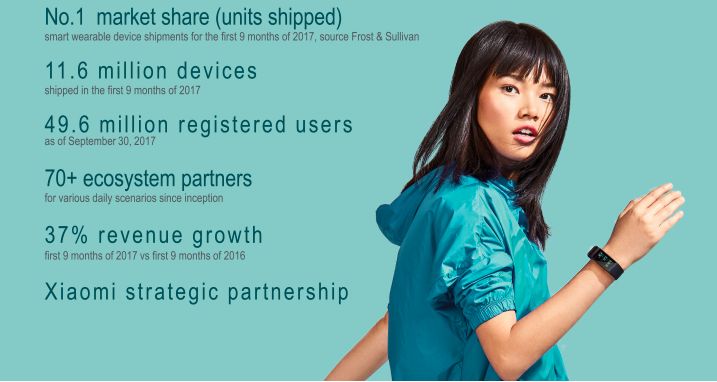 根据资料,2017年1-9月华米科技旗下产品出货量为1160万件,旗下所有产品的注册用户达到了4960万,已成长为世界上最大的智能手环出货商。