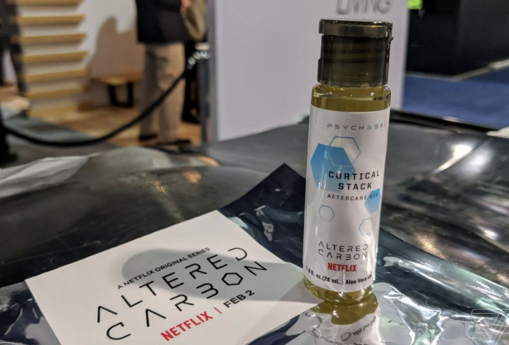 不过,让人感到疑惑的事情又再出现了。在 Cortical Stack Aftercare Gel 的包装内还有另一张卡片,上面印着 ALTERED CARBON 字样,还带着 Netflix 的标志。这不是一家生物科技公司吗?在仔细看看周围屏幕上播放着的宣传片,片尾都出现了 Netflix 的标志。