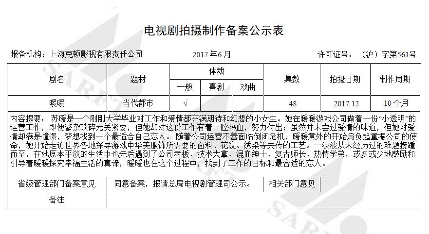 去年年中,广电总局拍摄电视剧备案的通知显示,手机游戏《奇迹暖暖》将被改编成电视剧《暖暖》,由上海克顿影视有限责任公司进行报备,预计将有48集,当年12月开拍。