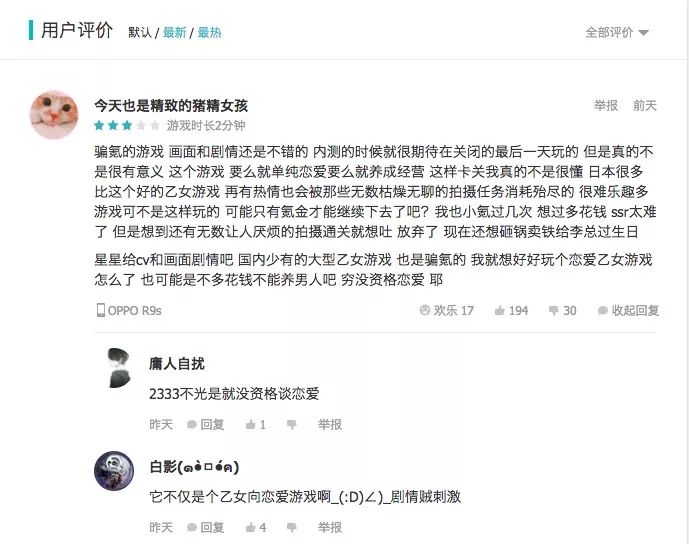 “一个是觉得要花很多时间肝,没那么多时间玩养成,第二个是手气很非,但是又不想花钱。”游戏界有个俗语:玩儿游戏靠肝,不靠脸,非就是手气不好。汤懒懒是典型的90后,她对每一款话题新游戏都保持着尝试的态度,然而恋与似乎没有获得她的好感,“第三制作略粗糙,基本就是静态画面,玩法单一,最感兴趣的互动部分占比少,声优不足以支撑我花大量时间去肝。”