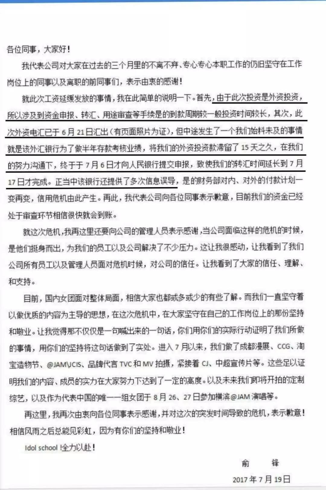 让俞峰心急的是,到了7月中,无论是对综艺的投资,还是对女团的投资都还没有到账。那段时间,俞峰每天回到公司都会问财务投资方的款项到账没有,彼时距离公司和投资方签订投资协议已经一个月了。
