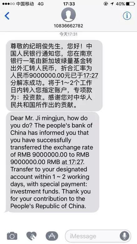 当时,同样看到短信的郑瑜觉得末尾“感谢您对中华人民共和国所作出的贡献”这句话有点奇怪,随后他找在银行工作的朋友咨询,虽然银行的朋友也觉得奇怪,“但因为不是外汇部门的,具体也不能确定。“