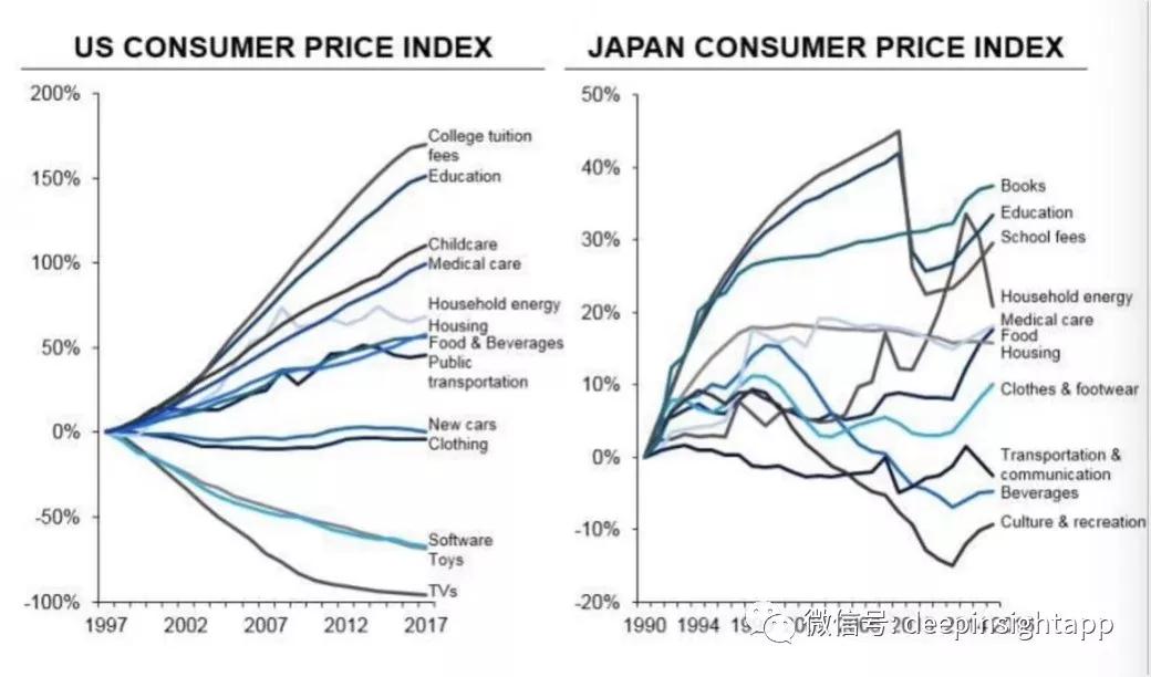 下面这张图相信许多人已经看过,对比了美国20年,日本将近30年的物价水平。
