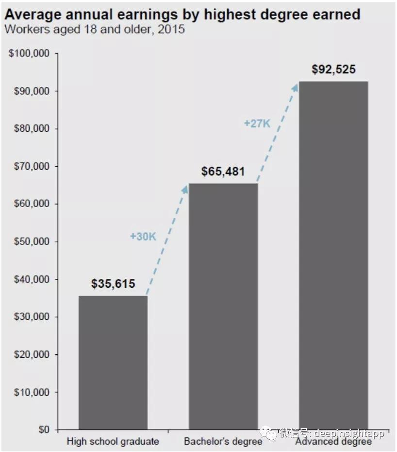 我们再来看另外一张图:2015年全美18岁以上人口根据其学历的平均工资水平。我们看到高中学历在美国的平均工资为3.5万美元年薪,大学本科学历的平均工资为6.5万美元年薪,硕士及以上学历的平均工资为9.2万美元年薪。基本上每增加一个级别的学历,年薪会提高3万美元。从平均收入水平来说,教育在美国是非常有效的。假设以4年学习时间,10万美元总学费为每一个级别跳升的成本。这个投入在长期的生命中,带来巨大回报。