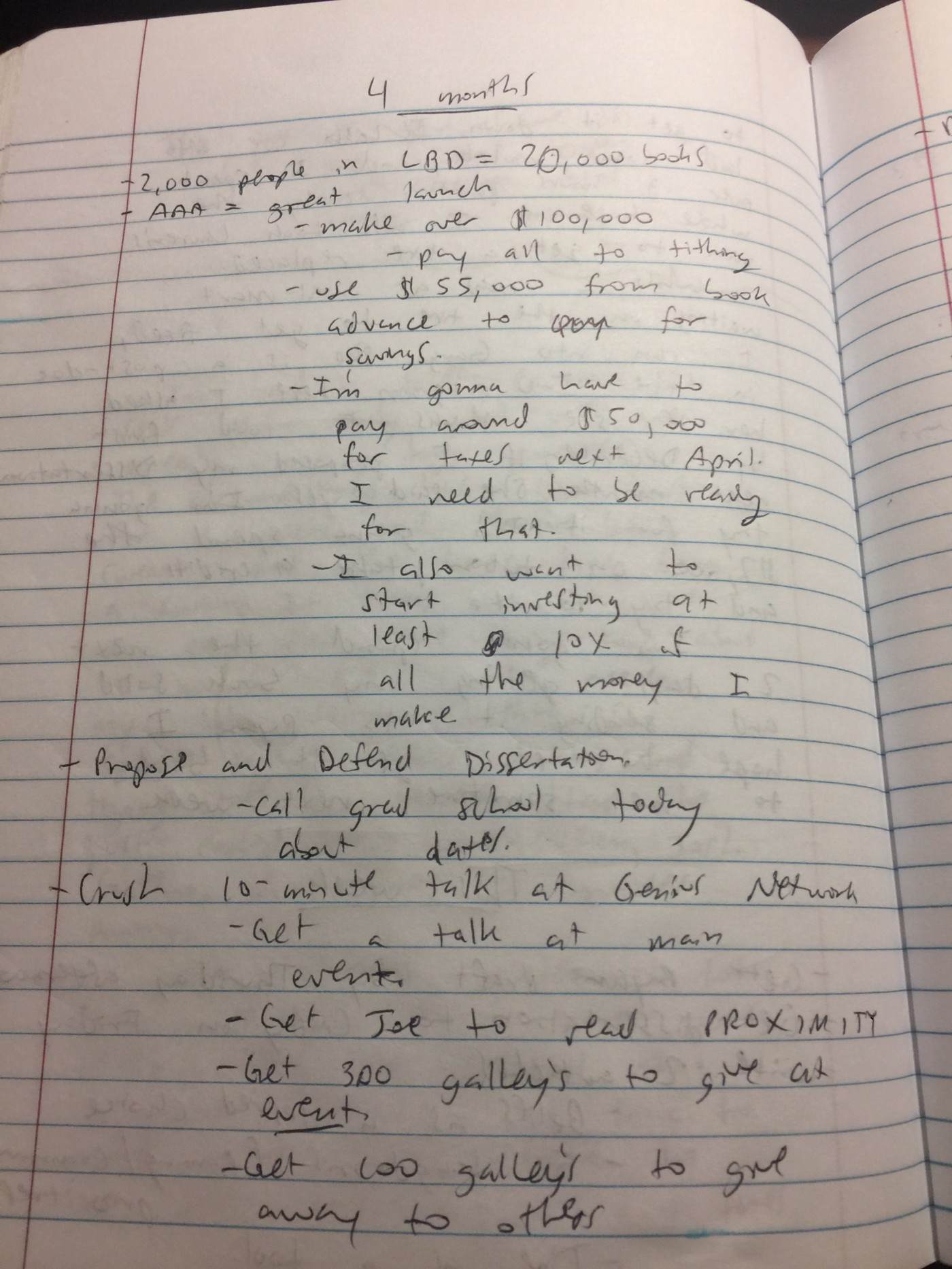 每天都要写下你的目标。然后,在早上饱满的精神状态下,你应该写下自己为实现目标所需要做的一切,包括你要联系的人、你这周要做的事情,甚至包括你今天要做的事情。以下是我日记中的一些例子: