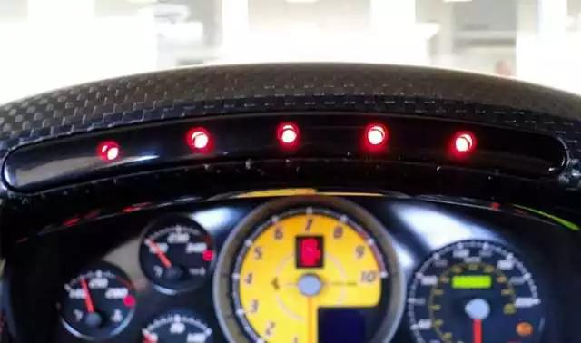 当转速超过 4000 转时,随着转速不断攀升,每达到一个整数,方向盘上的档位指示灯就会亮起一盏,直到转速爆表,红灯全亮: