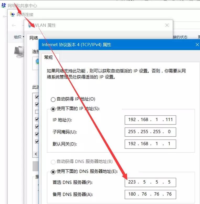 网络配置,通常在 控制面板==》网络和 Internet===》网络连接 找到连接宽带或者路由器的连接图标,右键,属性,然后双击“internet 协议版本4 (tcp/ipv4)”进入检查DNS设置。这里我们可以按小编这两个地址:一个是阿里提供的一个是百度提供的免费DNS地址,比较可靠。也可以减少一些DNS污染的情况。