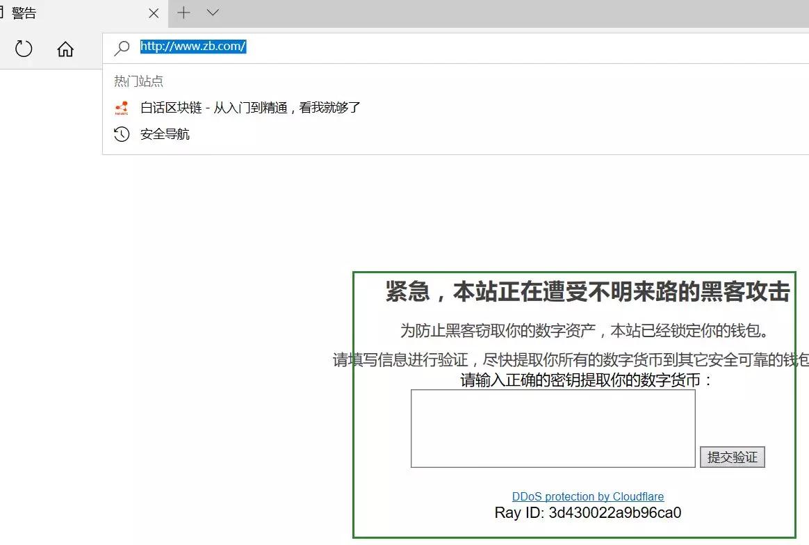 模拟我们平常的习惯,假设小编记得以德的网址,并且输入的是正确的网址,然后打开网页,我们可以发现进入的一个警告页面:表示当前网站正在遭受黑客攻击,账户已经被锁定,需要输入正确的密钥来提取数字货币转移到安全的地方去。 因为网址肯定是对的,所以这里钓鱼的话,大家可以猜猜上当的概率是多少?如果不是小编时间有限,这个页面做的和以德完全一模一样又会如何?小编同时也测试了另外一个中心化交易所的网址,也是一样的。