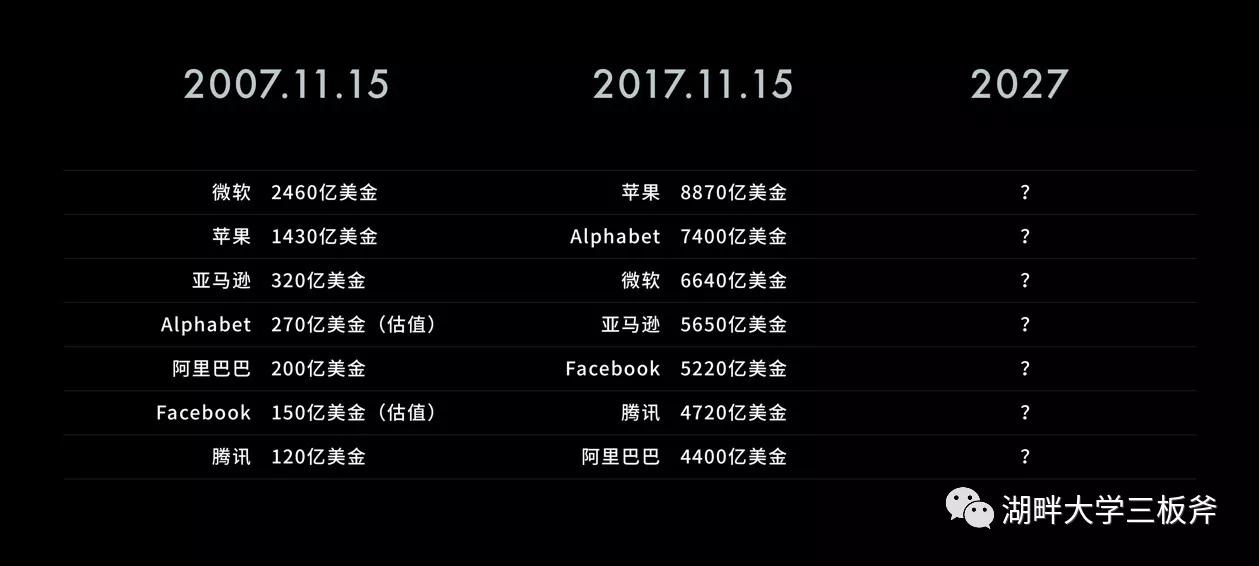 这张表(上图)到2037年很可能就完全没有意义了,因为到时候资本、财富、市值,甚至资本市场都不再存在。但2027年离我们足够近,这个表还有点意义。今天,大家看这张表单,是不是有一点野心和幻想——也许十年后你也可以出现在上面。