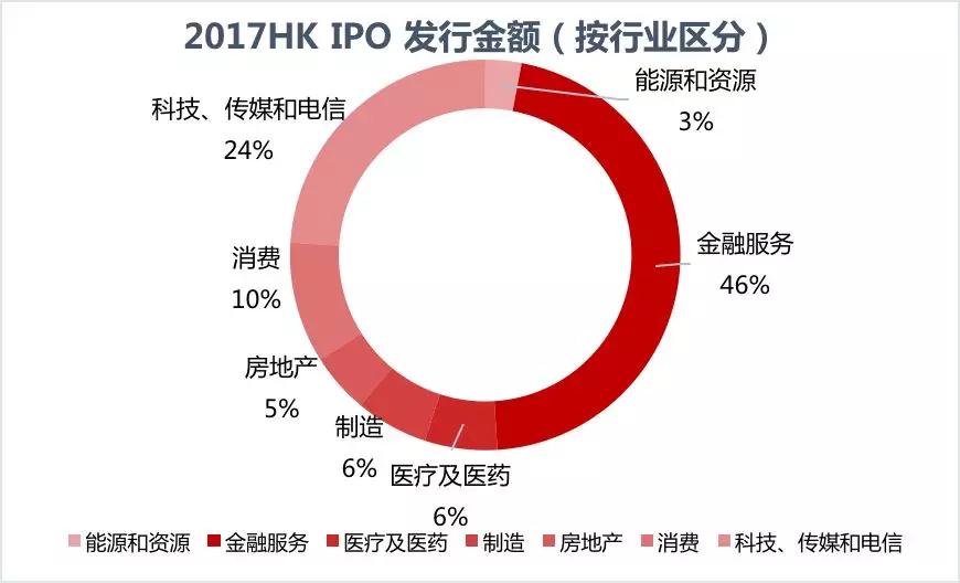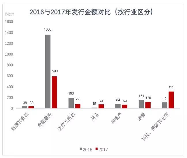 从绝对融资金额来看,消费与科技、传媒、电信(TMT)已经超过地产,成为市场的主要力量;TMT行业更是异军突起,金额已经接近一直长期占据新股发行金额榜首的金融业。金融业因体量大的行业特殊性,仍居2017年港股市场发行金额第一,但相比2016年大幅下降,且不乏众保险这类“互联网金融”企业。